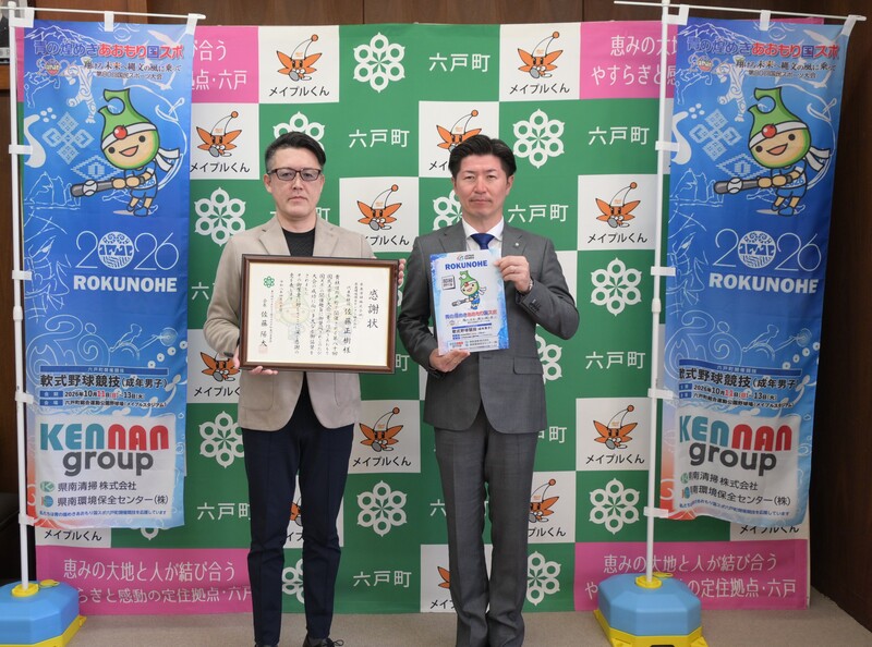 この度、県南清掃株式会社様・県南環境保全センター株式会社様(代表取締役 佐藤 正樹 様)より、国スポの六戸町開催をPRするための広報啓発用品として、クリアファイル1,500枚、のぼり旗(ポール含む)40枚をご協賛いただき、4月20日に協賛物品の引渡しと感謝状の授与が行われました。