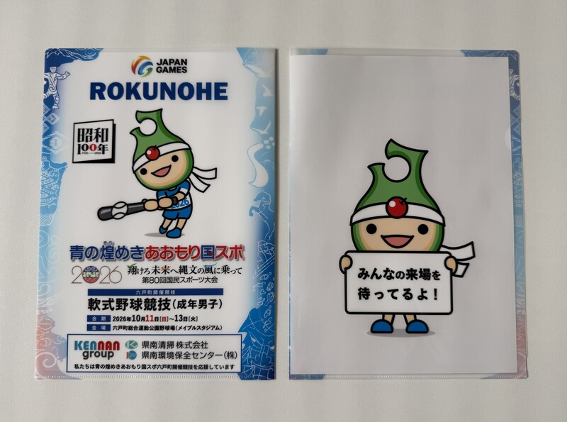クリアファイルはイベント等でのPR活動に、のぼり旗は競技会場となる六戸町総合運動公園周辺に設置し、国スポのPRに広く活用させていただきます。